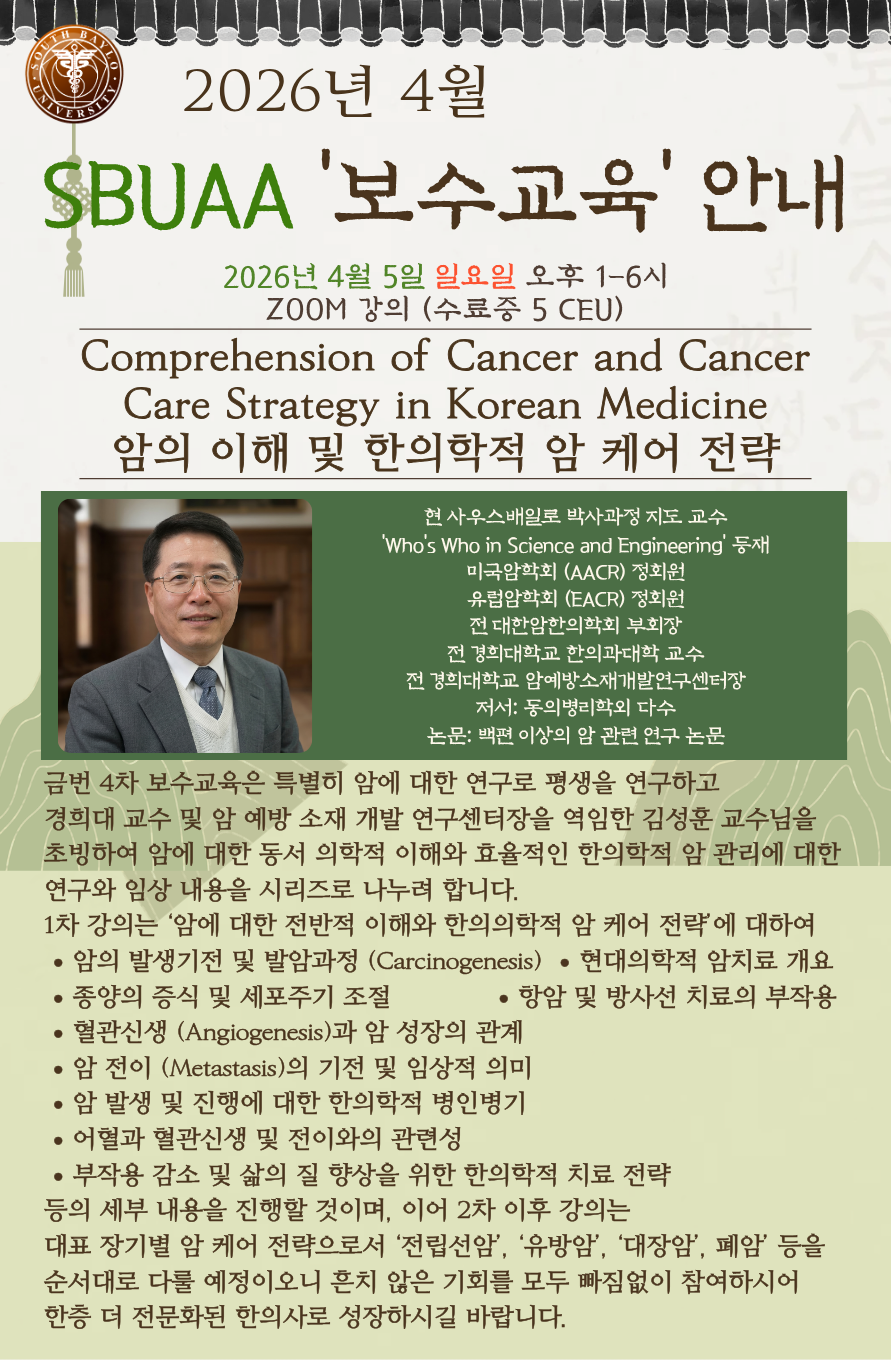 2025년 SBUAA 4월 보수교육 - Comprehension of Cancer and Cancer Care Strategy in Korean Medicine (암의 이해 및 한의학적 암 케어 전략)